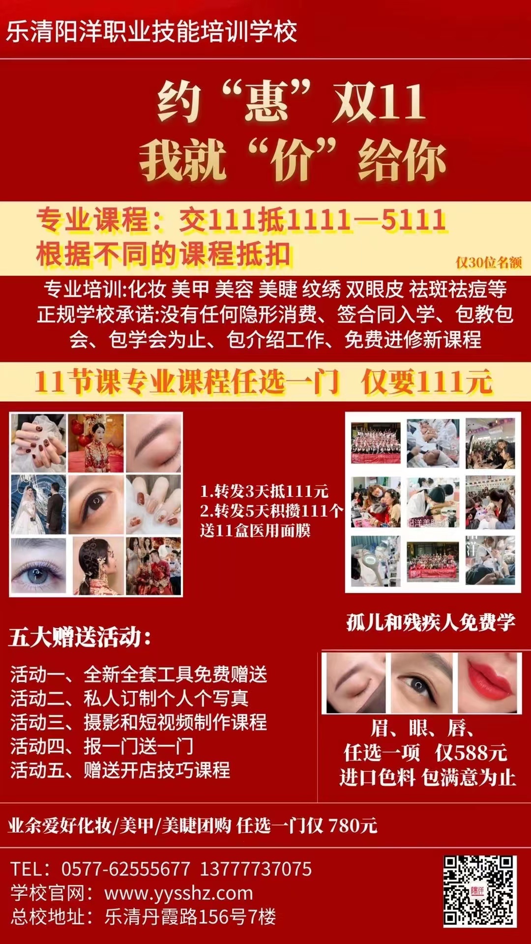 當(dāng)前位置:樂(lè)清市陽(yáng)洋職業(yè)技能培訓(xùn)學(xué)校 » 優(yōu)惠資訊雙11活動(dòng)正式開(kāi)啟 #樂(lè)清哪里有學(xué)化妝發(fā)布時(shí)間:2023-10-31 18:40:01 瀏覽次數(shù):2029 |