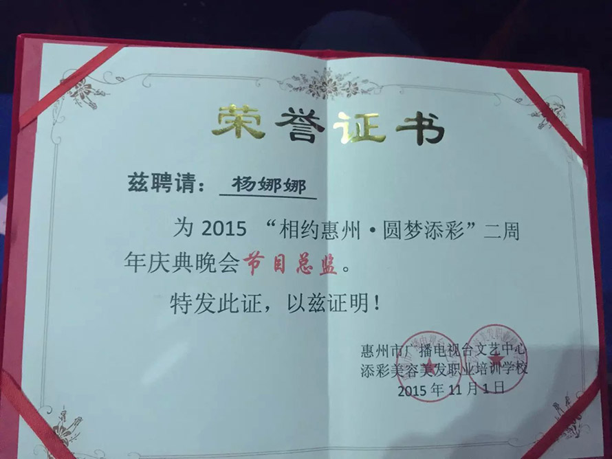 惠州電視臺(tái)“相約惠州 圓夢(mèng)添彩"慶典晚會(huì)11月1日惠州市拉開(kāi)帷幕,慶典晚會(huì)的節(jié)目總監(jiān)由 樂(lè)清陽(yáng)洋時(shí)尚化妝美甲培訓(xùn)學(xué)校的中國(guó)著名化妝造型師、國(guó)家組化妝大賽評(píng)委、楊娜娜老師擔(dān)任,樂(lè)清陽(yáng)洋時(shí)尚化妝培訓(xùn)學(xué)校是 楊娜娜老師精心創(chuàng)建是國(guó)內(nèi)一流的時(shí)尚化妝美甲紋繡學(xué)校。十四年內(nèi)參與國(guó)內(nèi)大型比賽榮獲多次獎(jiǎng)項(xiàng),妝面造型風(fēng)格受到業(yè)內(nèi)的高度好評(píng),優(yōu)秀學(xué)生更是遍布全國(guó)各地。