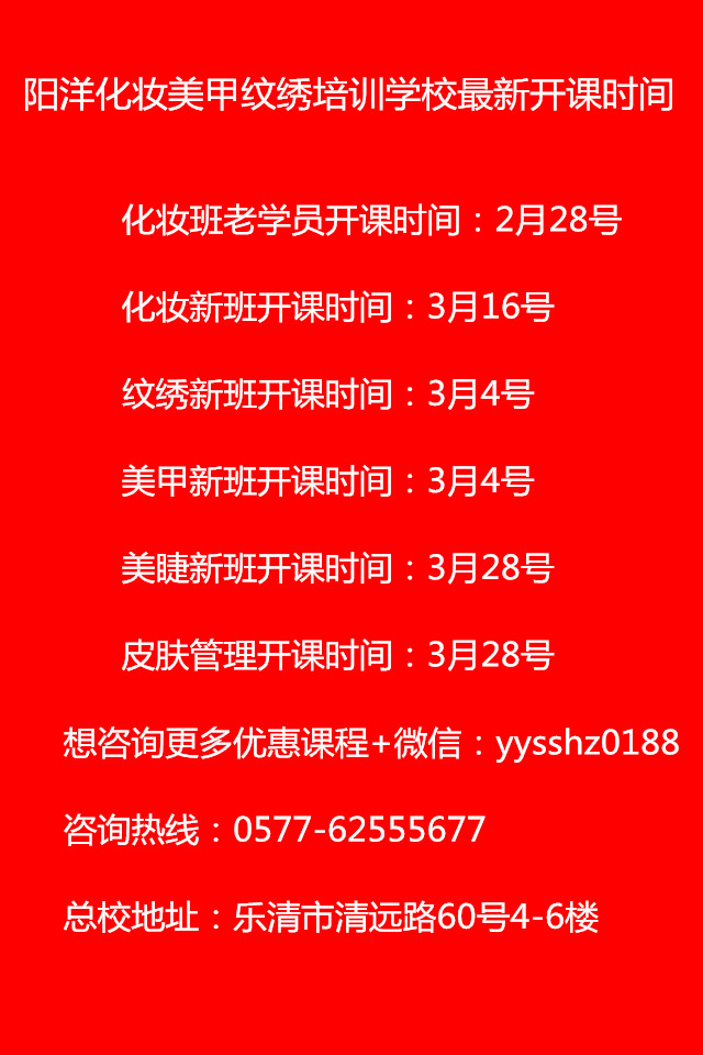 樂(lè)清陽(yáng)洋化妝職業(yè)技能培訓(xùn)學(xué)校歡迎你的加入! 具體課程可加微信:yysshz0188進(jìn)行了解~