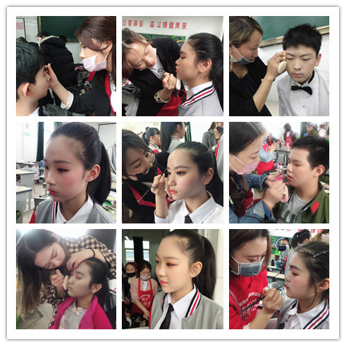 當(dāng)天同學(xué)們就早早的起床集合,去往公益化妝地點(diǎn),為要表演的小朋友們做化妝造型工作