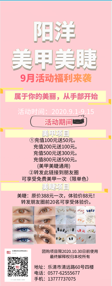 當(dāng)前位置:樂清市陽洋職業(yè)技能培訓(xùn)學(xué)校 » 學(xué)校新聞陽洋15分鐘美睫不止半價(jià),還能免費(fèi)做美甲!來陽洋化妝學(xué)校享受美甲美睫超級(jí)體驗(yàn)價(jià)~發(fā)布時(shí)間:2020-9-1 9:11:25 瀏覽次數(shù):1984 |