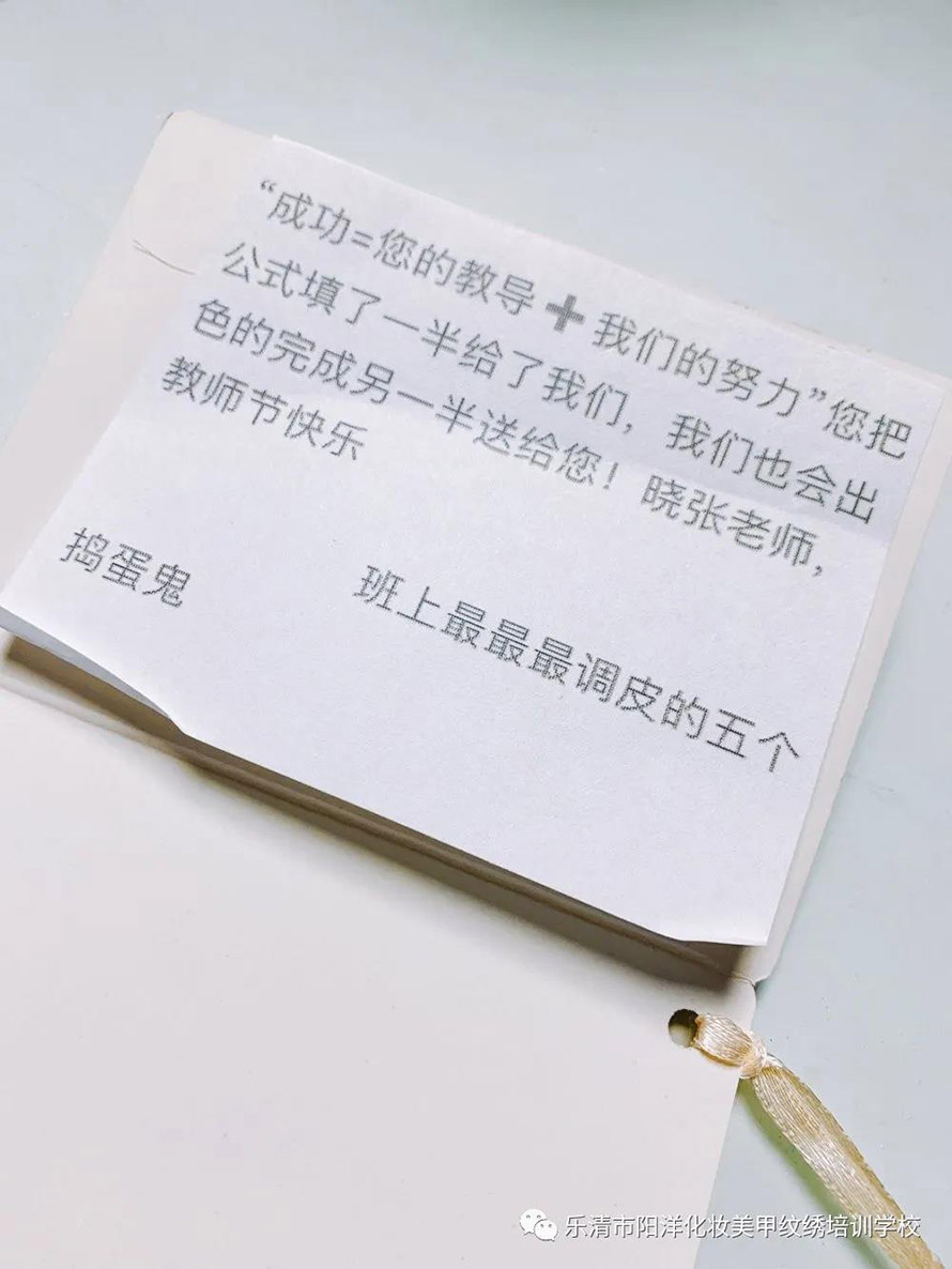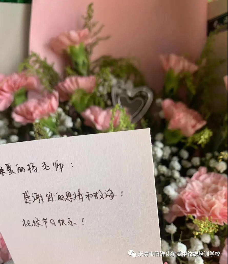 不求桃李滿天下,只去無愧于初心。懂得“感恩”是一種生活態(tài)度,是一種美德。9月10號教師節(jié),弘揚(yáng)尊師重道的優(yōu)良傳統(tǒng),再一次拉近了師生之間的距離,讓老師們度過了一個(gè)難忘的教師節(jié)。 感謝學(xué)生們送的鮮花禮物和賀卡還有各種小驚喜,陽洋化妝學(xué)校祝你們前程似錦,越來越優(yōu)秀!