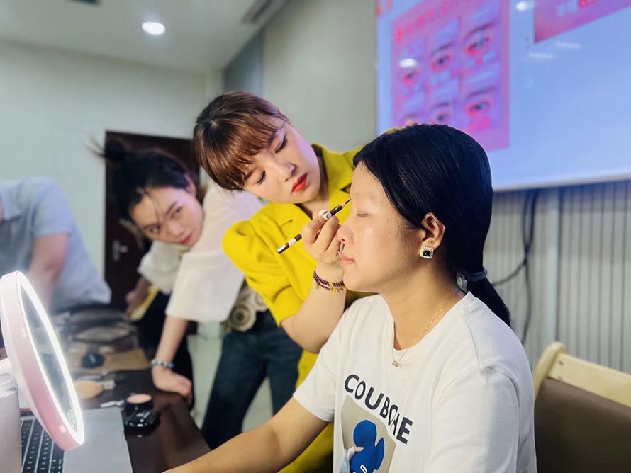 首先講課理論知識(shí)——實(shí)踐給學(xué)生看——再一對(duì)一改妝——30多人老師一對(duì)一的改,