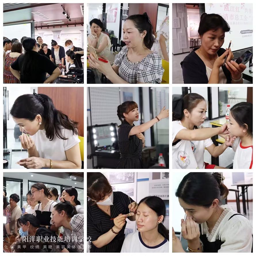 2022年7月10日陽洋時尚化妝培訓學校在北白象白塔王社區(qū)由樂清總工會舉辦的一場, 針對不會化妝社區(qū)人員的化妝技巧化妝課程。