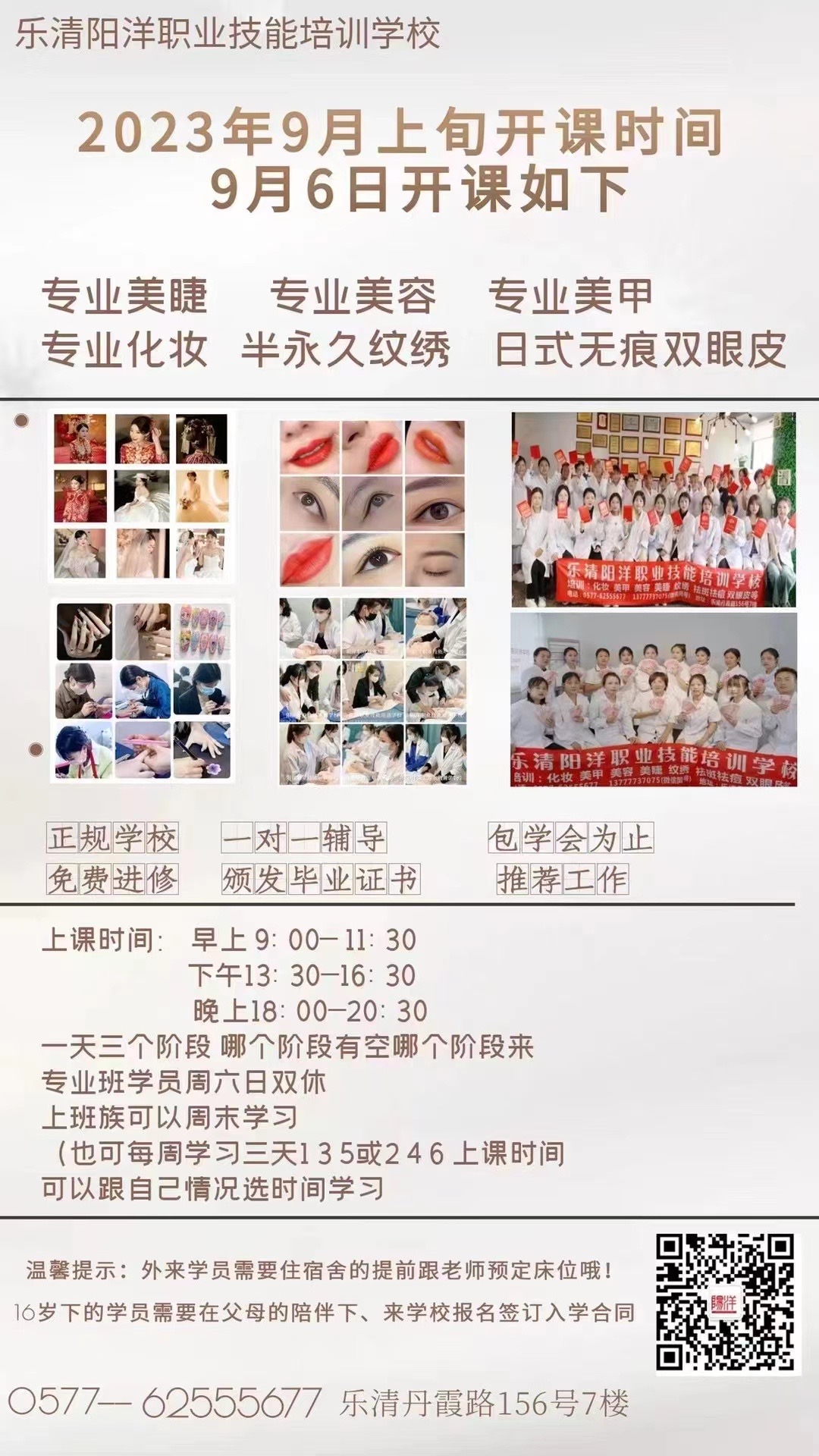 九月新班開課時間通知,九月六號新班正式開課,需要住宿舍的同學(xué)一定要提前預(yù)定哦。來陽洋化妝培訓(xùn)學(xué)校學(xué)習(xí),白天有空白天學(xué),晚上有空晚上學(xué),把空余時間利用起來。讓自己學(xué)會一門技能 |