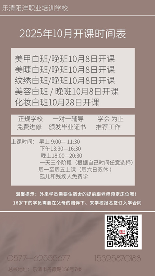 當前位置:樂清市陽洋職業(yè)技能培訓學校 » 學校新聞2025年10月開課時間表|樂清哪里有學化妝|柳市哪里有學化妝|虹橋哪里有學化妝|學化妝多少錢|發(fā)布時間:2025-9-29 16:00:06 瀏覽次數(shù):71 |