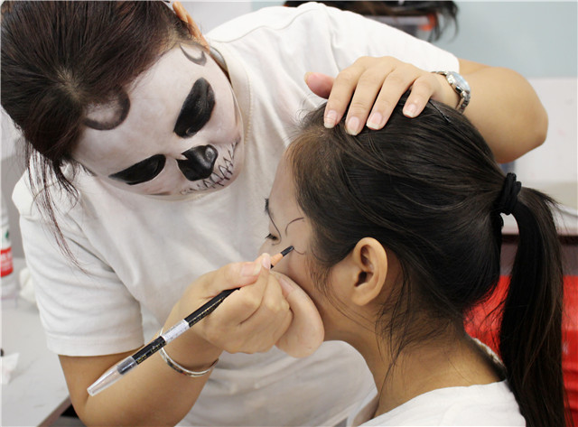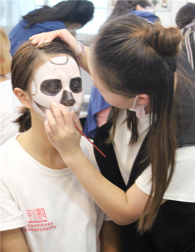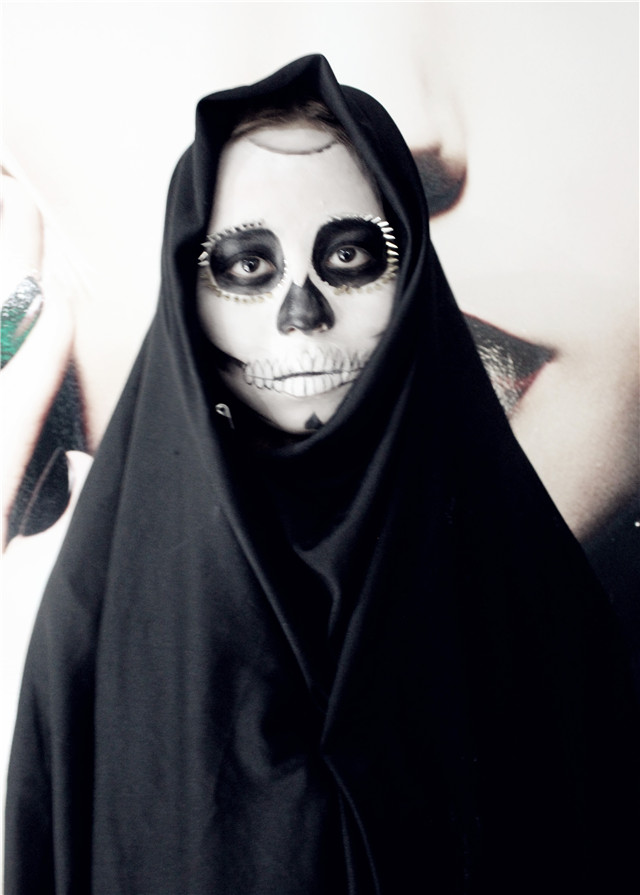 所謂骷髏妝,就是要求將臉部用油彩畫成骷髏的形狀。畫這種妝需要對(duì)人的骨骼結(jié)構(gòu)有足夠的認(rèn)識(shí),所以被稱為影視妝容的基礎(chǔ)課程.是成為優(yōu)秀化妝師的必修課。