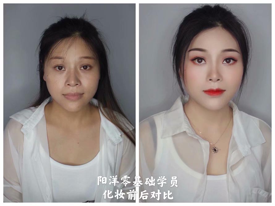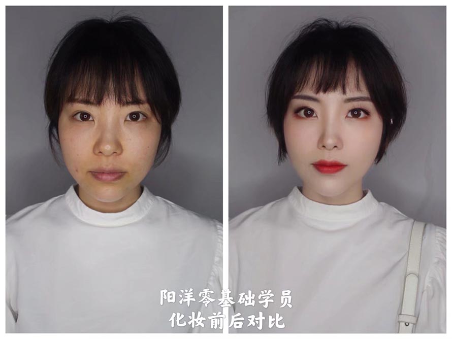看看這個姑娘的化妝前后對比、差距可以說已經(jīng)是非常大了、 這也是為什么大家現(xiàn)在都爭先恐后學(xué)化妝的理由啦 這個作品 是我們零基礎(chǔ)才學(xué)習(xí)幾天的同學(xué)第一次化妝 雖然不是特別的完美、但對于剛學(xué)習(xí)的新手小白來說已經(jīng)很棒了